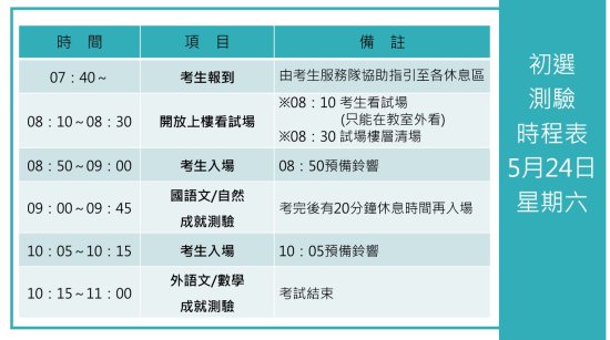 (二) 5/24 (六)將由本校帶隊老師於 8:10-8:30 區間帶領考生觀看考場座位,逾時不候。