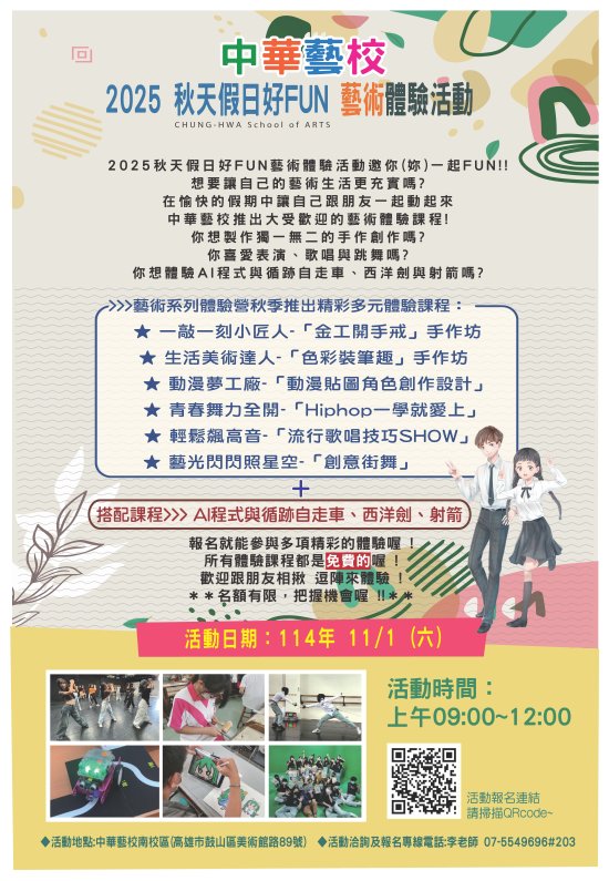 二、今年秋季推出「2025 秋天假日好 FUN 暑假藝術體驗」活動,全程免費,歡迎對「金工、動漫貼圖、 AI 、流行樂與青春街舞」等藝術活動有興趣的學生,鼓勵暑假期間一起來參與,相關活動內容如附件。