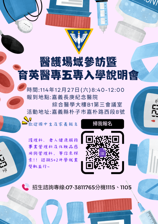 一、為了協助國中家長及同學了解五專特色及入學方式,以及認識醫護場域、 5+2 進修就業雙軌並行等!特舉辦本活動。