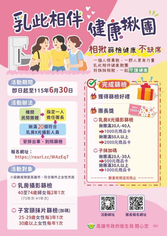 主旨:本局辦理 115 年「乳此相伴 健康揪團」篩檢計畫,惠請貴單位協助公告宣傳並鼓勵轄內單位踴躍組團參加,以共同守護女性健康,請查照。