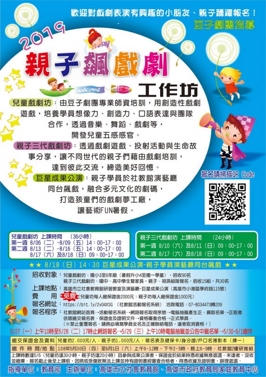 二、培訓對象: 1.兒童戲劇坊:現就讀國小 3 至 6 年級學童,招收 90 名。 2.親子三代戲劇坊:國中、高中學生暨家長,親子、祖孫組隊報名,招收 15 組,共 30 名。
