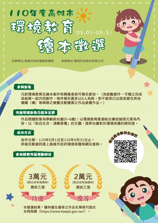 六、獲獎獎勵:評獲特優、優等分別可獲得 3 萬元、 2 萬元獎金(或等值商品)及獎狀乙張。獲獎作品之作品名單將刊登於環保局局網。