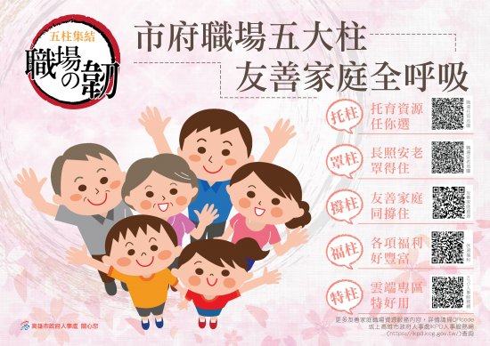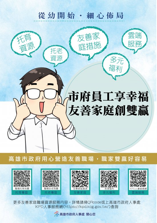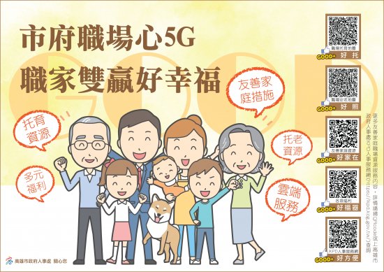 一、市府為營造家庭友善職場,有效推廣職家資源,特繪製旨揭宣導海報樣式 3 份,供同仁參考使用(各友善職場措施內容,請掃海報上的 QR-CODE )。