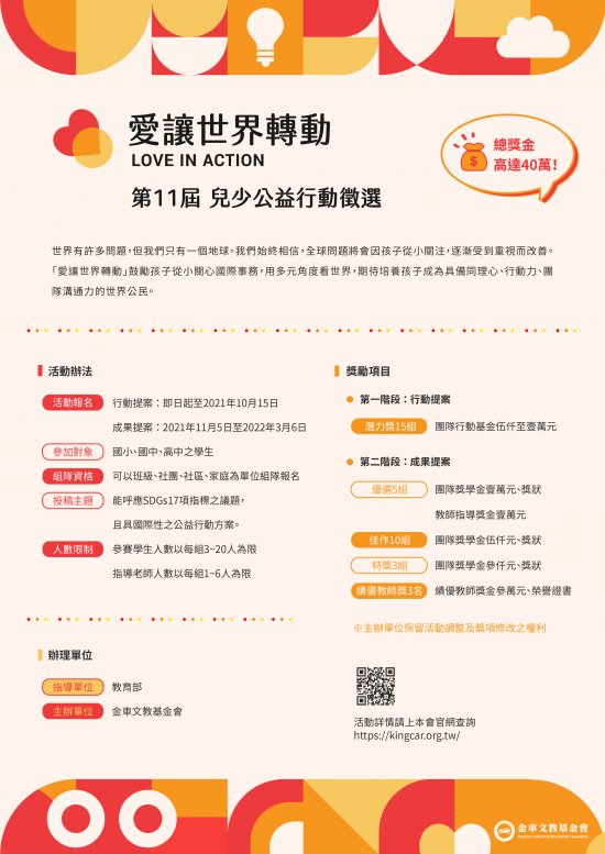 一、本會自 2011 年開始舉辦「愛讓世界轉動 兒少公益行動」徵選,多年來累積超過萬名來自全台各地師生踴躍參與,以 STAGE 行動步驟讓孩子走進世界舞台,學習發現問題、付諸行動、發揮愛心並能收穫成長。
