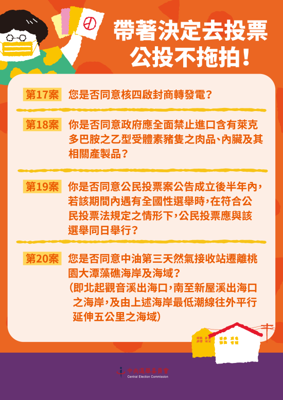 二、 110 年 12 月 18 日(星期六)為全國性公民投票案第 17 案至第 20 案之投票日,請投票權人進入投票所前,先瞭解各公民投票案相關內容,事前審慎考量,進入投票所即可立即決定要投同意或不同意,以加快圈票速度。