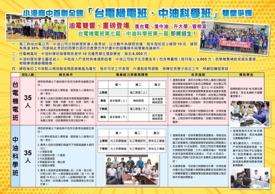二、本校 110 學年成立中油科學班,中油科學班與既有台電機電班均訂有會考成績條件及戶籍限制,相關報名資訊及獎學金請參閱附件文宣。