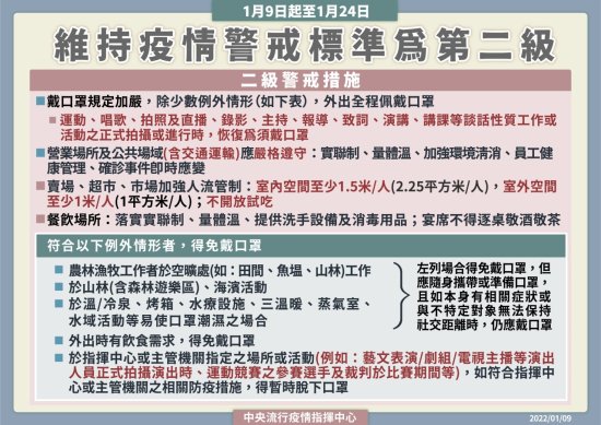 主旨:因應嚴重特殊傳染性肺炎國際間新變異株 Omicron 威脅,中央流行疫情指揮中心宣布自本( 111 )年 1 月 9 日至本年 1 月 24 日維持疫情警戒標準為第 2 級,並請落實相關防疫措施,請查照。