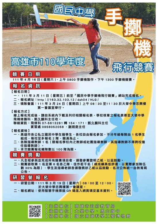 月 16 日(週六)高雄市 110 學年度國中學校手擲機飛行競賽和