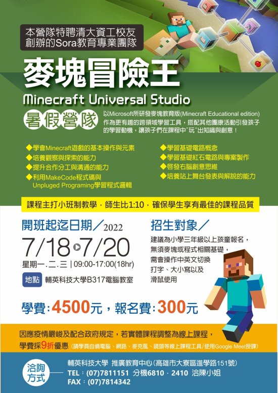 一、課程特色:以麥塊教育版(Minecraft Educational edition)作為學習工具,讓孩子們從玩樂中學習,搭配其他團康活動引發孩子的學習動機,讓孩子們在課程中∀玩∀出知識與創意!