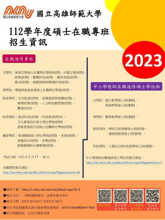 二、招生簡章請自行於本校網站(https://c.nknu.edu.tw/ccee/Album.aspx?PN=43&PClass=G2005&GI=2)即可下載,招生簡章不另行發售。