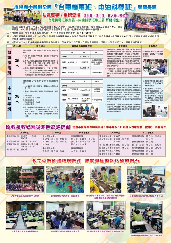 二、本校 110 學年起成立中油科學班,中油科學班與既有台電機