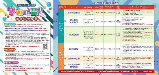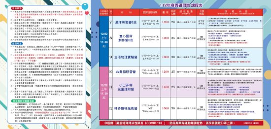 一、本期開設桌球、藝術創作、漆彈、籃球、流行舞、實境解謎、生活物理、 MV 舞蹈、理財、魔術營等課程。 二、報名方式:自 111 年 12 月 22 日上午 10 時起線上報名( https://bit.ly/2D1KZaN ),各班額滿提前截止。 三、簡章可至本館網站( http://www.kmseh.gov.tw )最新消息下載,另請加入【高市社教館 line】,掌握最新課程訊息。 四、檢附 112 年寒假營招生簡章及活動海報各 1 份。