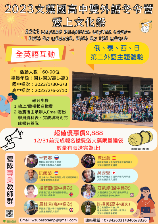 三、活動對象:國中學生(採全英語教學與活動進行,報名時請檢附 111 學年度成績單英文 70 分以上或全民英檢初級初試通過證明)。