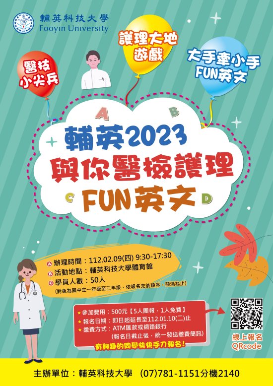 一、本校舉辦【輔英 2023 與你醫檢護理 FUN 英文】國中冬令營活動(詳細訊息請參閱附件),敬請惠予公告,並鼓勵貴校學生踴躍報名。