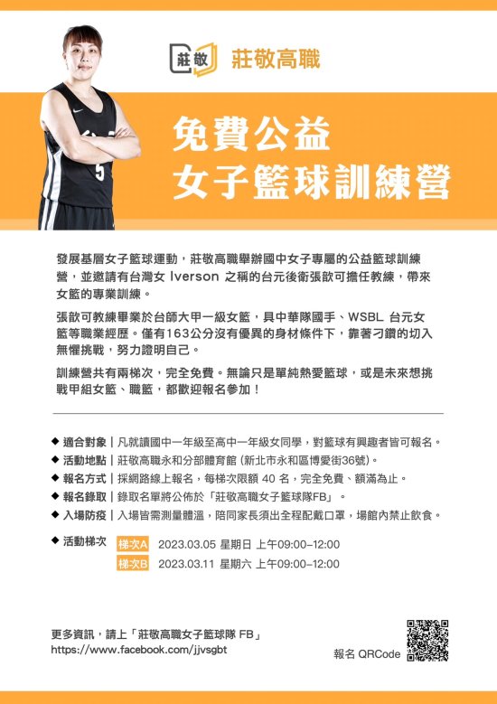 一、為協助發展基層女子籃球運動,莊敬高職舉辦國中女子專屬的公益籃球訓練營,並邀請有台灣女 Iverson 之稱的台元後衛張歆可擔任教練,帶來女籃的專業訓練。無論只是單純熱愛籃球,或是未來想挑戰甲組女籃、職籃,都歡迎報名參加。