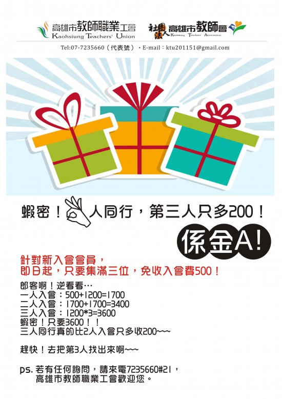 一、入會費優惠:針對新入會會員,即日起,只要滿 3人入會,每人免收入會費 500元。