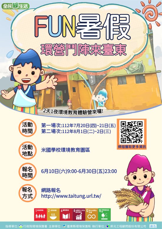 主旨:轉知臺東縣環境保護局於 112 年 7 月 20~21 日及 8 月 1~2 日,辦理 2 梯次「寒(暑)假期環境教育營隊計畫-Fun 暑假 環營逗陣來臺東」,請踴躍報名參加並協助廣為宣傳週知,請查照。