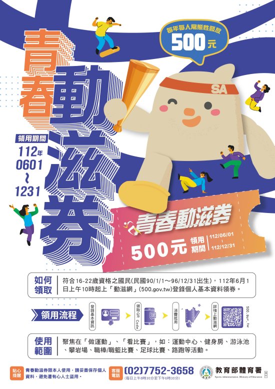 二、青春動滋券相關資訊可上動滋網( 500.gov.tw )查詢,或電洽客服專線 02-77523658 (每日上午 8 時 30 分至下午 6 時 30 分)。