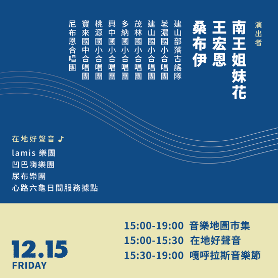 一、市府與尼布恩人文教育關懷協會共同辦理「第四屆嘎呼拉斯音樂節活動」,訂於 112 年 12 月 15 日(星期五)下午 3 時至晚間 7 時,及 12 月 16 日(星期六)下午 3 時至晚間 7 時,連續兩日,假六龜區寶來國中操場舉辦,請惠予協助宣傳周知並歡迎市民朋友踴躍參與。活動詳細資訊請洽活動官方臉書:https://www.facebook.com/KAHUZASMUSICFESTIVAL/?locale=zh_TW。