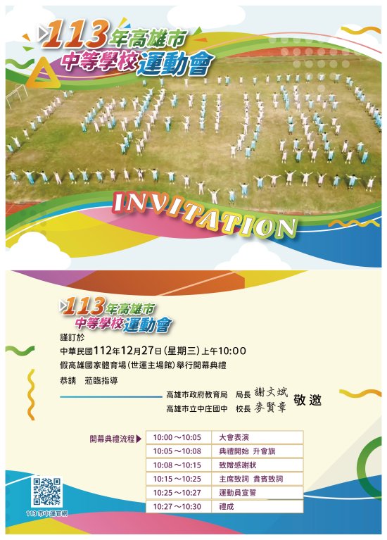 說明: 一、本校承辦 113 年高雄市中等學校運動會,開幕典禮訂於 112 年 12 月 27 日(星期三)上午 10 時,假高雄國家體育場舉行。 二、為響應節能減碳無紙化趨勢,以電子邀請卡邀請貴校校長及師生,鼓勵踴躍前往會場觀禮,當天頒發感謝狀致謝各協辦單位。