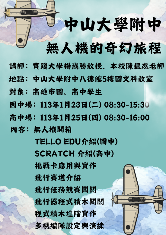 二、旨揭活動內容為教導學生應用 Tello EDU 益智編程及 Scratch 、 Python 和 Swift 等編程語言指揮多部 Tello EDU 無人機編隊飛行,特聘實踐大學楊崴勝助理教授團隊及本校陳振杰教師授課。