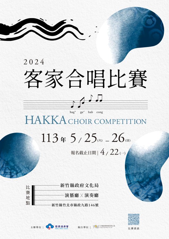 二、客家委員會為推動客家語言與文化永續傳承,訂於 113 年 5 月 25 日至 26 日(星期六、日)假新竹縣文化局演藝廳及演奏廳舉行旨揭活動,比賽組別包括合唱類「兒少組」及「青少組」、現代阿卡貝拉類「學生組」以及傳統山歌類等,報名自即日起至 113 年 4 月 22 日(星期一)止。