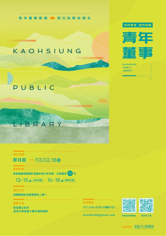 一、為促進青少年公共事務參與,建置公共圖書館與青少年溝通交流的平台模範,邀請本市青少年擔任「青年董事」,透過青少年政策參與及意見蒐集,強化圖書館青少年服務措施,並提升本市青少年參與公共事務及發表意見。