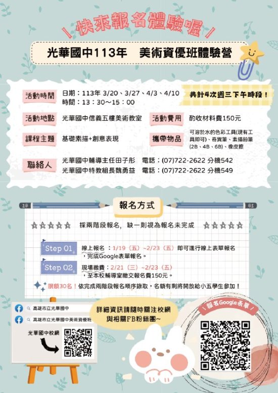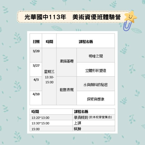 光華國中 113 年美術資優班體驗營開始報名囉~