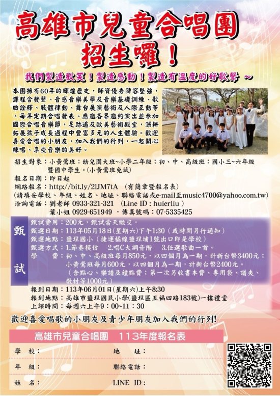 一、高雄市兒童合唱團於 113 年 5 月 18 日(六)下午 1 : 30 於鹽埕國小進行團員甄試,招生訊息網址 http://bit.ly/2lJM7tA 二、檢附高雄市兒童合唱團招生宣傳單乙份(如附件一)。