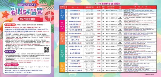 一、本期開設桌球、籃球、童心藝術、 MV 舞、魔術方塊、魔術、生活物理、手機拍微電影、童心運動、活力體能、閱讀寫作、故事繪本、英語戲劇、快速記憶法、流行舞、圍棋、兒童理財、吉他、小偵探、寶藏獵人、撞球、日本童謠手作、相聲、說故事、自信表達、手機攝影、數學桌遊營、手作小達人等班別,課程多元,歡迎報名參加。
