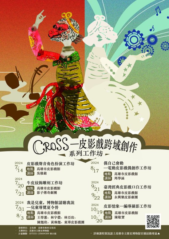 二、高雄市立歷史博物館於今( 113 )年假高雄市皮影戲館及捷運岡山高醫站推出《回·聲-皮影戲的跨域藝術》及《岡好》 2 檔跨域藝術特展,邀請陳敬寶、吳修銘及周學涵三位藝術家以皮影戲為主題進行藝術創作。為使大眾更加了解皮影戲的跨界藝術,將於 7 至 10 月辦理「CROSS─皮影戲跨域創作系列工作坊」,期盼以嶄新的風貌翻轉對皮影戲的印象,鼓勵大眾親近在地文化。
