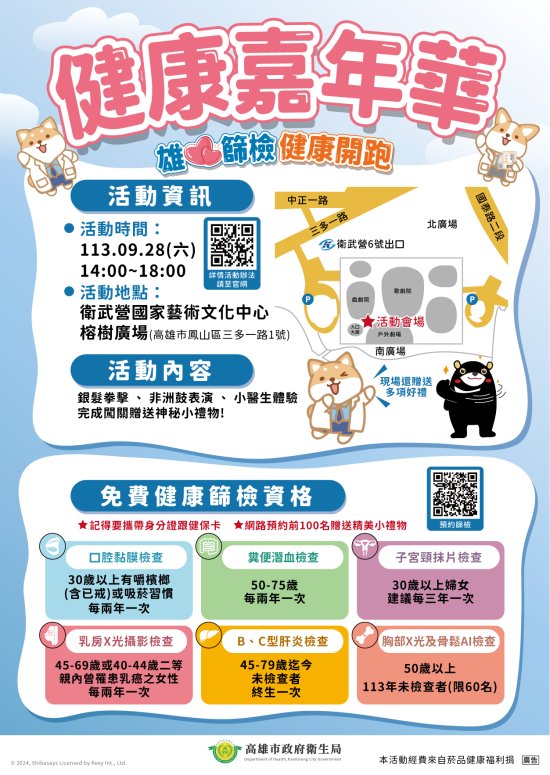 二、本局於 113 年 9 月 28 日(星期六)下午 14 : 00-18 : 00 於假衛武營國家藝術文化中心榕樹廣場舉辦「健康嘉年華」篩檢活動(如附件 2 ),活動內容包含銀髮拳擊、非洲鼓表演、小醫生體驗完成闖關活動獲得神秘禮物等,篩檢活動要攜帶身分證與健保卡,網路預約前 100 名可贈送精美小禮物,網址: https://cmsi.kchb.gov.tw/screening-appointmentfill-form