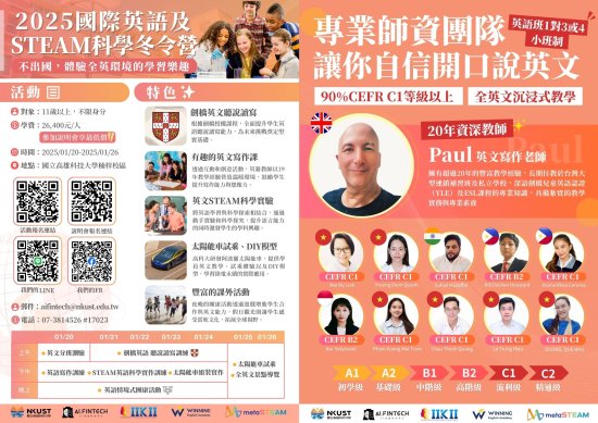 一、活動目的:本次冬令營將英語學習與動手科學探索相結合,旨在提升學生的英語能力與 STEAM (科學、技術、工程、藝術、數學)領域的知識,為 11 歲以上的學生提供一個跨領域、實踐性強的學習機會。學生將能在全英語環境中學習,提升語言技能並在動手實驗中探索科學,開拓全球視野。