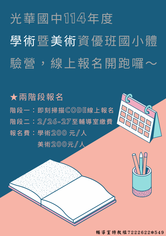 ( 2 ) 階段二:於 2/26 (三)~2/27 (五)每日早上 8 點-16 點至本校輔導室繳交報名費 200 元。