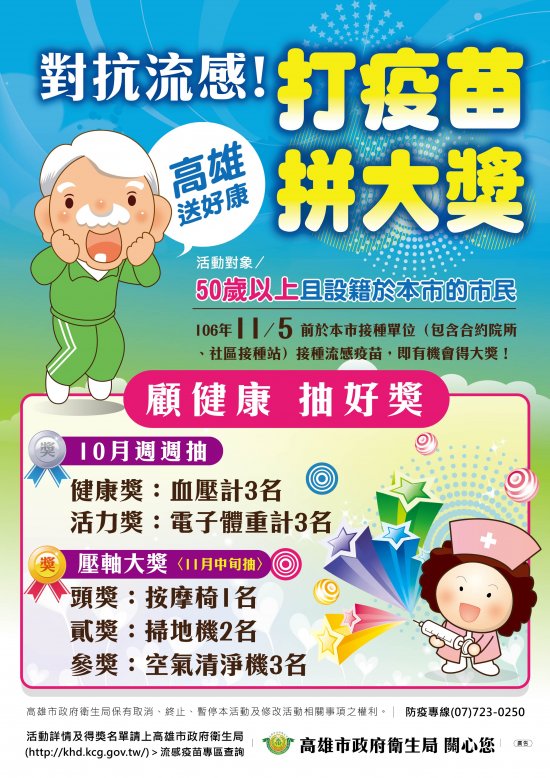 1、活動對象於106年11月5日前於本市接種單位(包含合約院所、社區接種站)接種流感疫苗,即有獲獎資格。