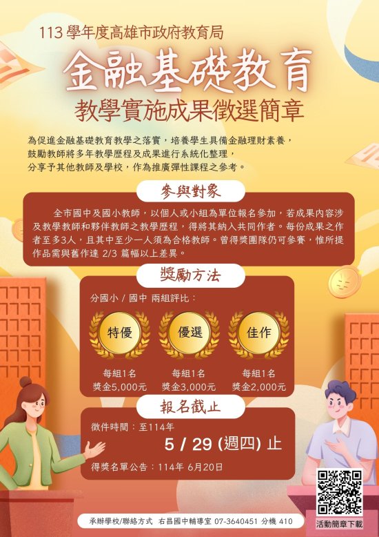 (三)本市初賽徵件時間: 114 年 4 月 1 日(星期二)起至 114 年 5 月 29 日(星期四)止,提交書面審查資料紙本一式 3 份及資料光碟一份,以掛號郵寄至「高雄市立右昌國中輔導室」(以郵戳為憑),寄件地址: 811005 高雄市楠梓區興昌里 6 鄰盛昌街 161 號(請於信封上註明「高雄市 113 學年度金融基礎教育教學實施成果徵選」)。
